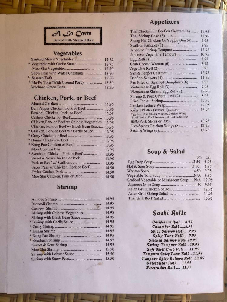 August Moon Asian Grill, located in Parker, CO, offers a wide range of Asian dishes with a focus on Chinese comfort food. The menu boasts options such as King's Platter Egg roll, crab cheese wonton, and Shang Hai Chicken for appetizers, and Wonton Soup and Vegetable Tofu Soup for soup lovers. The restaurant also features vegetable dishes like Snow Peas with Water Chestnuts and Broccoli with Garlic Sauce.